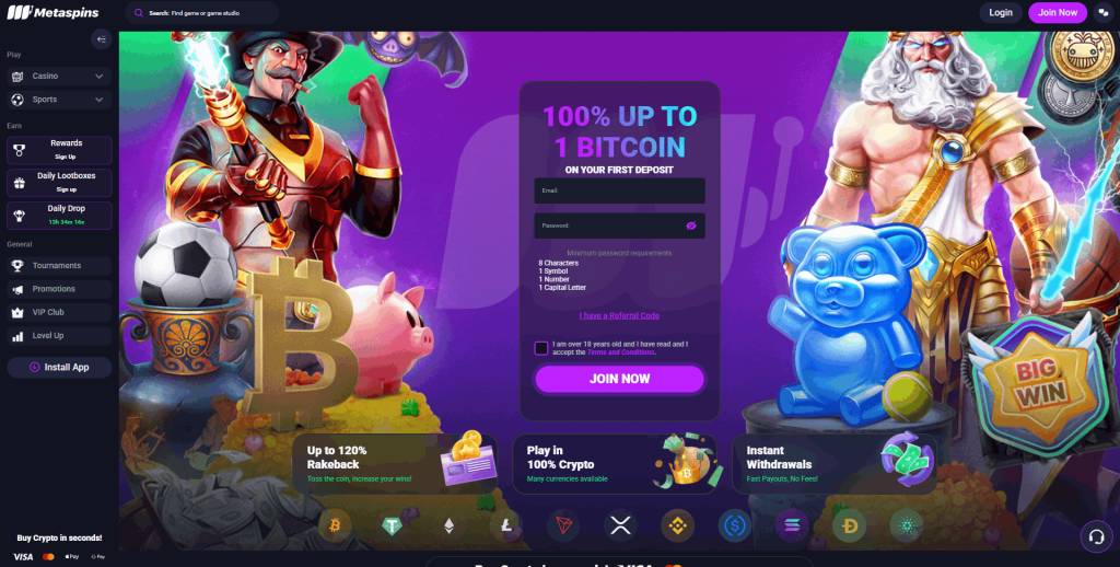 Metaspins mě oslovilo svým vesmírným tématem a důrazem na plnou decentralizaci. Nabízí zajímavý crypto casino bonus bez vkladu ve formě různých věrnostních odměn a rakebacku, který může dosáhnout až neuvěřitelných 120 %. Platforma je vizuálně velmi atraktivní díky fialovo-růžovým gradientům a je vidět, že cílí na komunitu kolem blockchainu a NFT.